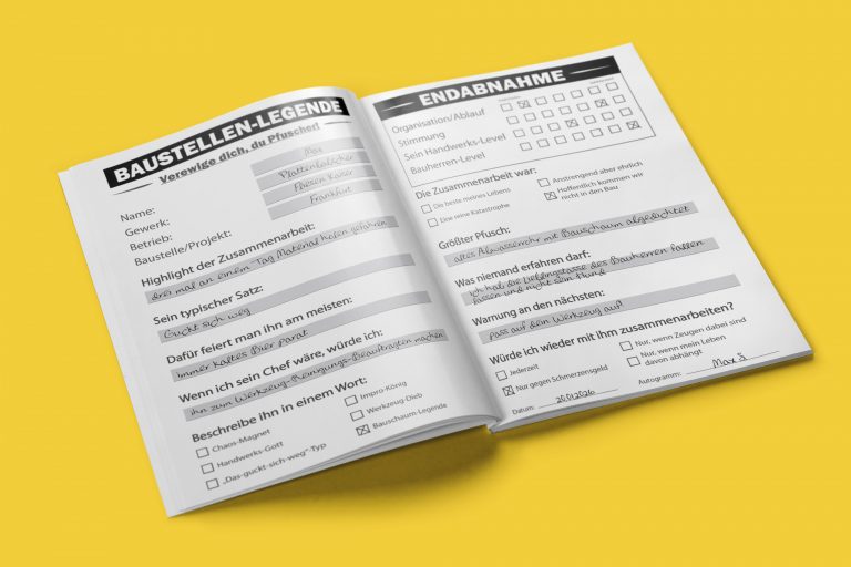 Mit „Baustellen-Legenden“ hat Florian ein Buch geschaffen, das nicht belehrt, sondern verbindet: ein Freundebuch für Handwerker, in dem Kollegen, Azubis und Baustellen-Bekannte verewigt werden – inklusive Sprüchen, Endabnahme und den Geschichten, die nur auf einer Baustelle passieren.